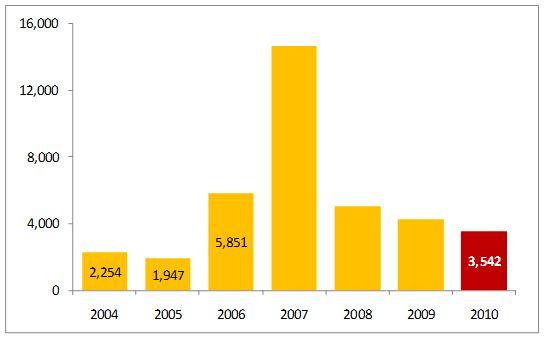 De acuerdo al gráfico, si bien en lo que va del primer semestre de 2010 se ha experimentado una fuerte caída con respecto a 2007, lo cierto es que el monto negociado se mantiene por encima de los obtenidos en los primeros semestres de 2004 y 2005 y no muy por debajo de 2006. Años “regulares” en los cuales no se experimentó el alza exponencial en el precio de los minerales.