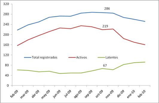 Si analizamos con detenimiento las cifras de la Defensoría, se observa que, de octubre de 2009 a febrero de 2010, el número de conflictos disminuye. De esta cifra cabe señalar que, si bien también disminuye la cifra de conflictos activos, los conflictos en estado latente aumentan. ¿De qué situación estamos hablando.