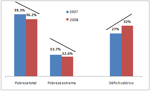 Un hecho que llama la atención es que, para el 2008, se reduce la pobreza extrema y, al mismo tiempo, la población con déficit de ingesta calórica aumenta. Es decir, en ese mismo año hay una mayor proporción de personas que no cubren un consumo mínimo de calorías respecto al año anterior (ver gráfico).