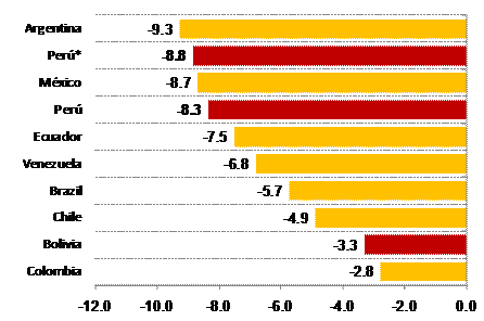 De acuerdo a las cifras, el ajuste peruano -reducción en la tasa de crecimiento- se encuentra entre los más altos de la región junto a Argentina y México. Sin embargo, hay que recalcar que en estas dos últimas economías fue donde más se agravó¹ la situación económica a raíz de la gripe porcina en 2009, por lo que en el ajuste de dichas economías este componente tiene mayor relevancia que para el caso peruano.