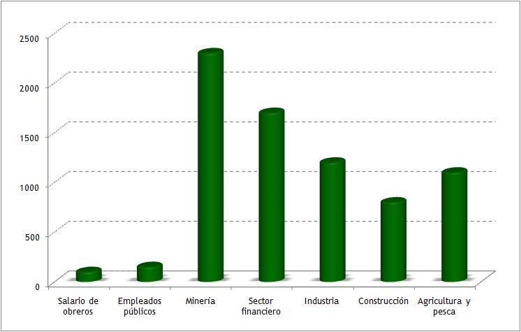 Al respecto, basta con revisar el cálculo de índices del ingreso laboral para distintos individuos realizado por el profesor Félix Jiménez. De acuerdo a dicho ejercicio, los ejecutivos de la minería ganan entre 23 veces más y los ejecutivos del sector financiero 17 veces más que un obrero. Mientras que el salario de obreros y sueldos de empleados públicos tienen niveles muy próximos entre ellos (ver gráfico).