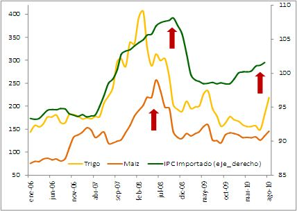 Al igual que en el segundo semestre de 2008, el reciente rebote inflacionario es esencialmente efecto de una inflación importada y no de un crecimiento en la inversión pública. Hoy en día, se viene experimentado una fuerte alza en el precio internacional del trigo y en menor medida del maíz (ver gráfico 1). De ambos productos somos país importador neto por lo que un alza en sus precios es transmitida directamente a su precio local y al de sus respectivos productos derivados (por ejemplo el pollo en el caso del maíz).