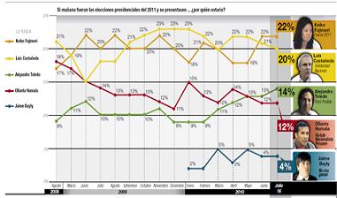 La última encuesta de Ipsos Apoyo, publicada por el diario El Comercio el domingo que pasó, revela que los dos candidatos presidenciales con mayor intención de voto son Keiko Fujimori (22%) y Luis Castañeda Lossio (20%).