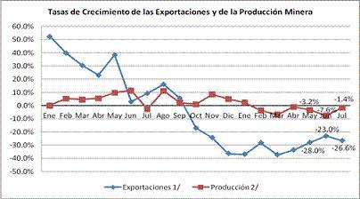Actualmente, las tasas de crecimiento de la producción y de las exportaciones mineras del Perú demuestran que este sector aún se encuentra golpeado por la crisis internacional y la contracción de la demanda de sus socios comerciales. En efecto, en el mes de julio, las exportaciones cayeron 26.2% respecto a julio de 2008, mientras que la producción fue 1.4% menos que en julio del año pasado (ver cuadro).