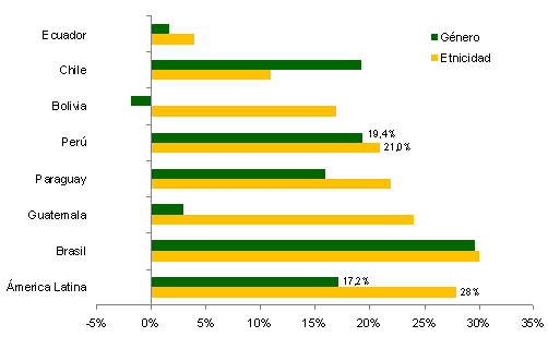 De acuerdo al estudio, las brechas salariales étnicas son más profundas que las de género. En América Latina, una persona de origen “blanco” percibe 28% más en términos salariales que una persona de origen “étnico minoritario²” con el mismo género, edad y nivel de educación. Mientras que un hombre percibe 17% más que una mujer, ambos con las mismas características (ver gráfico).