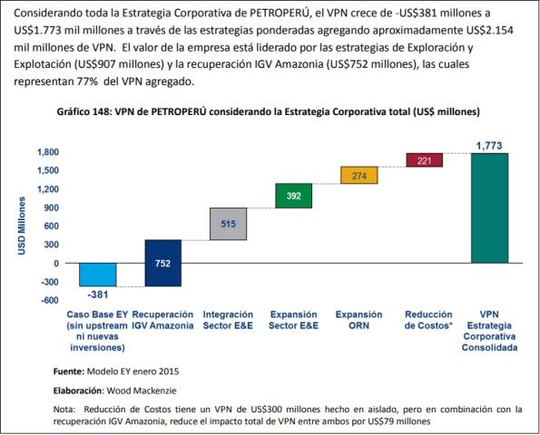La proyección elaborada por Wood Mackenzie desde el 2015 al 2030 decía que el Valor Presente Neto crecería desde un negativo de US$ 381 millones en el 2015 hasta un VPN positivo de US$ 1,773 millones en el 2030 (ver gráfico). Estimaron que la eliminación del IGV de la Amazonía proveería US$ 752 millones2 y que la integración y expansión al sector E&E aportaría US$ 907 millones (US$ 515 + 392). Petroperú aprobó el Informe de Wood Mackenzie.