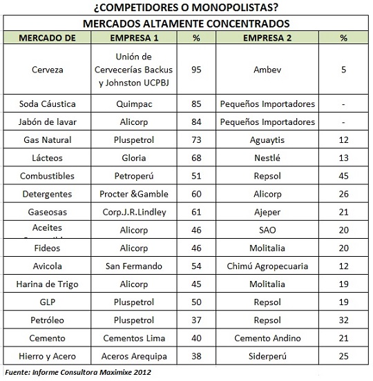 Una economía de crecimiento rápido y sin ninguna protección a la libre competencia como la nuestra ha conllevado a la formación de monopolios y oligopolios. El caso del grupo El Comercio es la punta del iceberg. Según el estudio ¿Competidores o monopolistas?, existirían unos 16 mercados altamente concentrados en el país. Uno de los casos más escandalosos es el de la empresa Unión de Cervecerías Backus y Johnston que, actualmente, ostenta el 95% del mercado de cerveza. Además, llama la atención el nivel de concentración del mercado de detergentes, cuyo 60% está en manos de Procter & Gamble. En esa misma línea se encuentra el sensible mercado de lácteos, donde el 68% lo maneja la gigante Gloria. Finalmente, el 84% del mercado de jabón de lavar se encuentra en manos de Alicorp. Estos mercados con alto grado de concentración son curiosamente de productos que afectan directamente la economía de los consumidores y sus hogares.